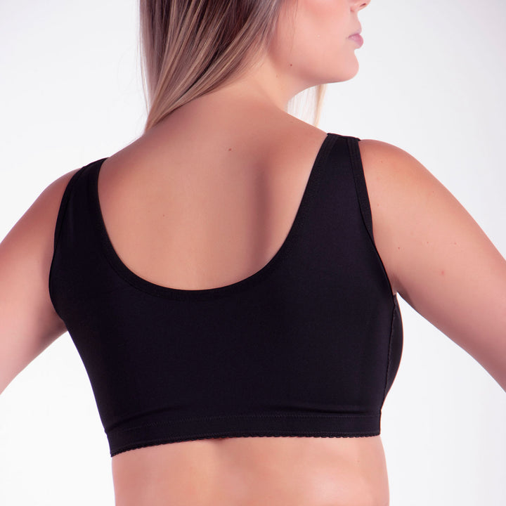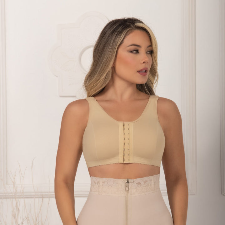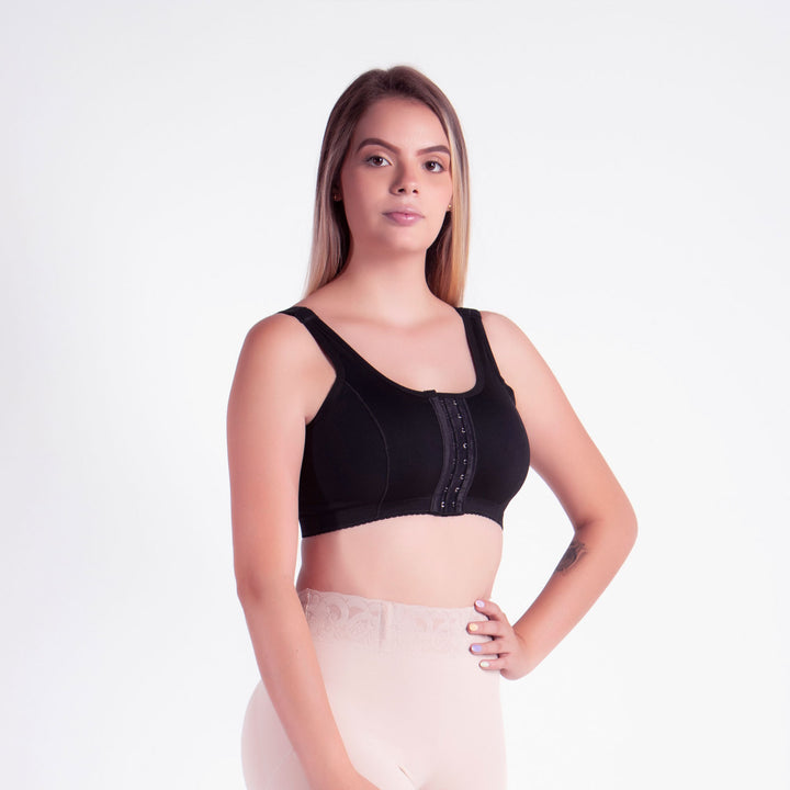 Brasier postquirúrgico facilita una mejor postura y ayuda a controlar el volumen del busto. Elaborado en una tela de baja compresión que permite un mayor ajuste y mejora la postura. Tiene además mayor cubrimiento en las copas, control en los laterales de la sisa y espalda. Cuenta con una practica abrochadura en la parte frontal con un nivel de ajuste. Un mecanismo de ajuste en los hombros de abrochadura con dos niveles de broches que permite que se adapte a la medida y al cuerpo. Es recomendado después de una cirugía de aumento o reducción de busto, es una prenda cómoda y liviana que brinda un buen soporte del busto gracias a su banda elástica en la base para mayor seguridad.