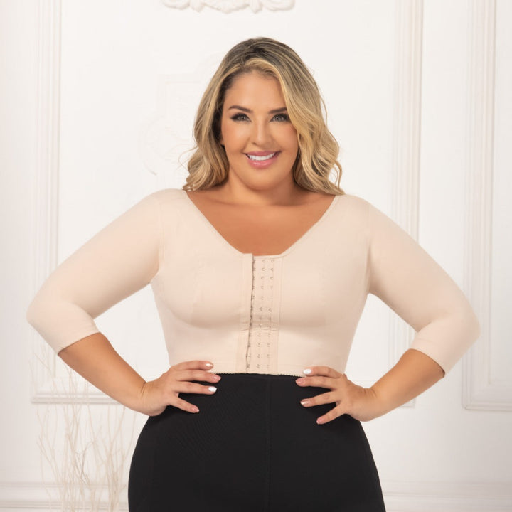 Chaleco postquirúrgico con mangas,funcional para cirugías de busto. Con brasier y abrochadura frontal de 9 ganchos . Recomendado por médicos tras cirugías de busto y brazos para evitar inflamación.